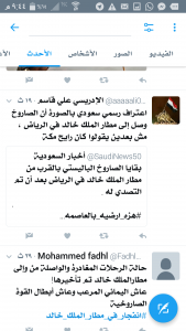 صحيفة الرياض السعودية الرسمية، نشرت من جانبها صور قالت انها لبقايا الصاروخ الباليستي الذي اطلق من اليمن، باتجاه قاعدة الملك خالد الجوية في الرياض، فيما نشر ناشطون سعوديون فيديو يبين حالة الاستنفار والطوارئ في المطار عقب وصول الصاروخ.