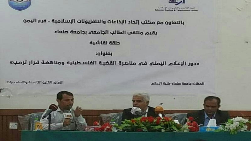 بالتعاون مع مكتب اتحاد الإذاعات والتلفزيونات الإسلامية في اليمن أقام ملتقى الطالب الجامعي بجامعة صنعاء حلقة نقاشية بعنوان : دور الإعلام اليمني في مناصر القضية الفلسطينية ومناهضة قرار ترامب.