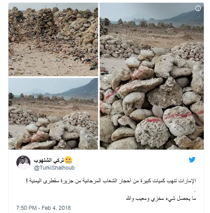 كشف ناشطون عن قيام الإمارات بسرقة حجارة “الشعاب المرجانية” من جزيرة سقطري لنقلها إلى أبو ظبي.