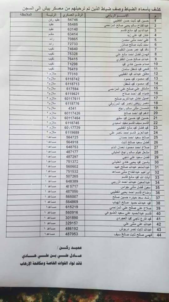 حيث قالت الوثيقةُ التي تضمنت أسماء أربعةٍ وأربعين مجنداً: إن المجندين الذين تم الزجُّ بهم في السجون السعودية هم من مجندي لواء مكافحة الإرهاب بمحافظة عدن.