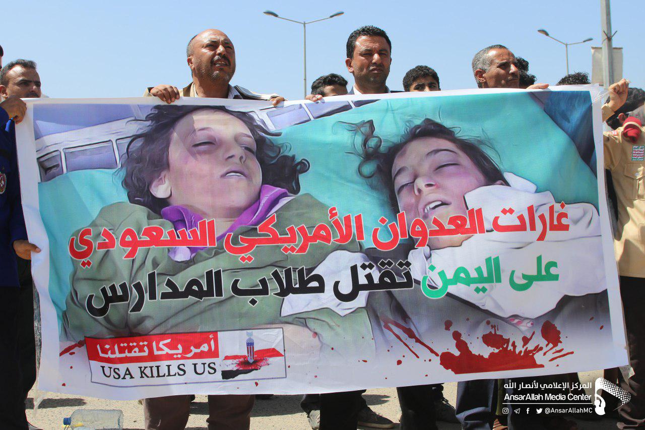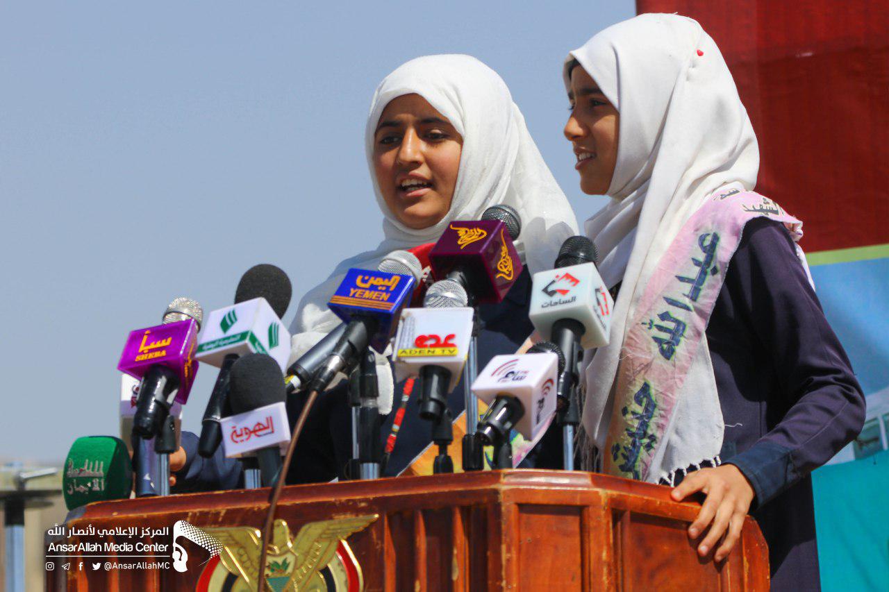 وألقت الطالبتان ياسمين الضيائي وإخلاص بادر من مدرسة “حنيش” قصيدة شعرية استنكرت جريمة التحالف السعودي الأمريكي، على الطالبات، مستهجنة الهمجية السعودية التي تقتل الأطفال بدم بارد التي فاقت جرائم اليهود في فلسطين.