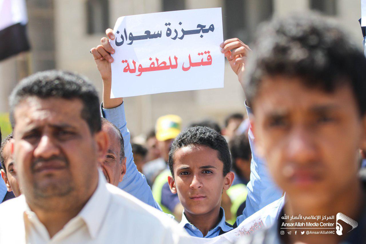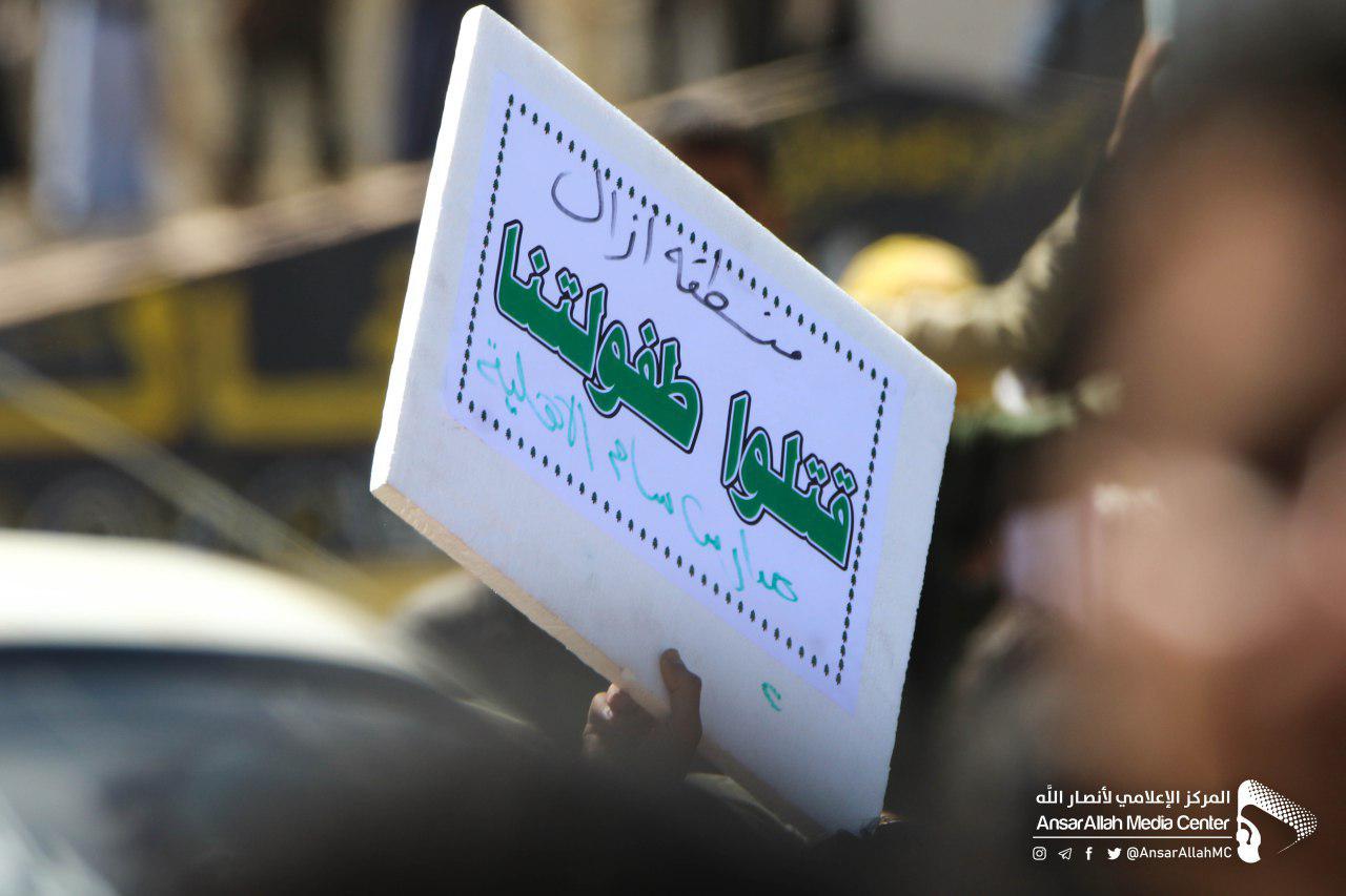وتقدم موكب التشييع عدد من وزراء حكومة الإنقاذ والمسؤولين المدنيين والعسكريين، وآلاف المواطنين الذين تقاطروا من مختلف مديريات العاصمة، رافعين لافتات تستنكر الجريمة وصورا لعدد من ضحايا، ورفع أحد المشيعين لافته كتب عليها “قتلوا طفولتنا”.