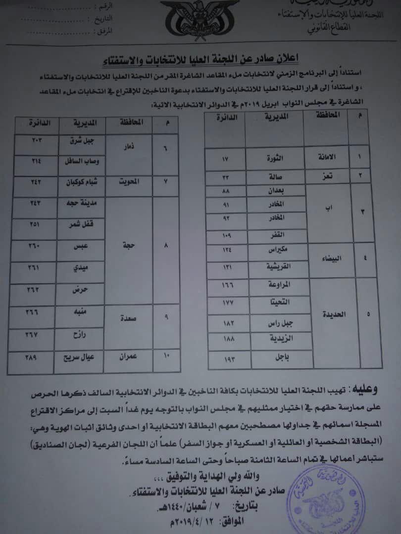 دعت اللجنة العليا للانتخابات والاستفتاء الناخبين التوجه إلى صناديق الاقتراع في انتخابات ملء المقاعد الشاغرة في مجلس النواب غدا السبت 13 إبريل 2019م في الدوائر الانتخابية التالية: