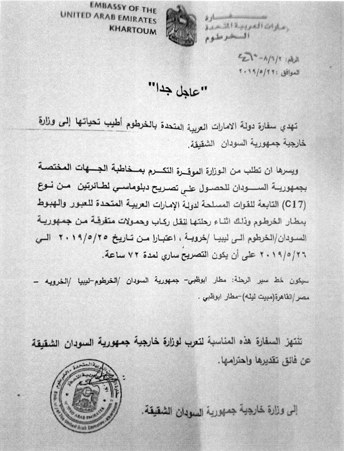 وفي رسالة أخرى طلبت تلك السفارة من السلطات المعنية الحصول على تصريح دبلوماسي لطائرتين من نوع (C17) تابعتين للقوات المسلحة الإماراتية للعبور والهبوط بمطار الخرطوم، خلال عبورها لنقل “ركاب وحمولات متفرقة” من الخرطوم إلى خروبة في ليبيا.