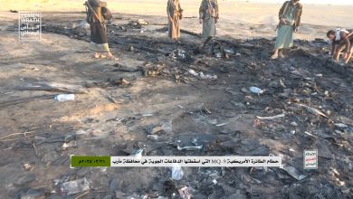 بعد ساعات من إسقاطها في مأرب.. الإعلام الحربي يوزع مشاهد حطام الطائرة الأمريكية MQ_9